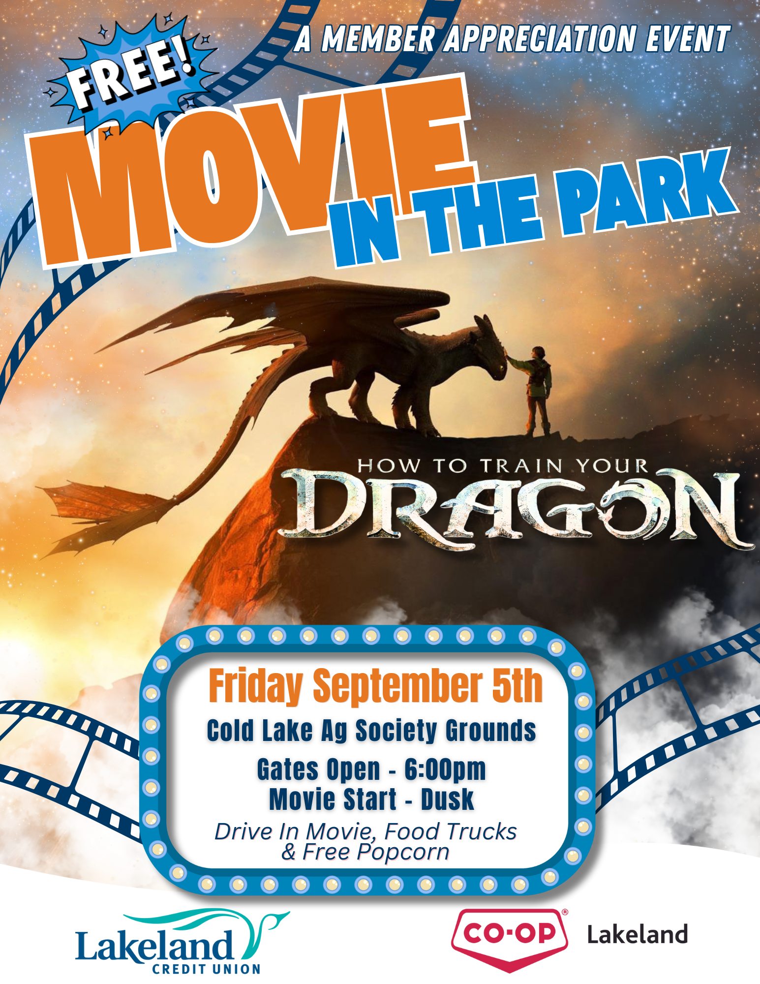 Lakeland Credit Union and Lakeland Co-op are teaming up to bring the magic of the movies to Cold Lake for one unforgettable night! Join us for Movie in the Park β a FREE drive-in movie experience to celebrate and thank our incredible members.